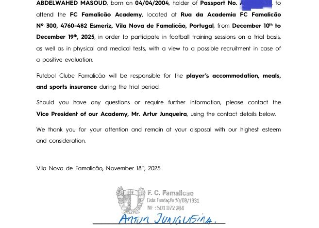تلقت نور عبد الواحد السيد لاعبة فريق مسار لكرة القدم، ومنتخب مصر، دعوة لقضاء فترة معايشة بنادي فاماليكاو البرتغالي، تمهيدًا للتعاقد معها رسميًا خلال الفترة المقبلة.